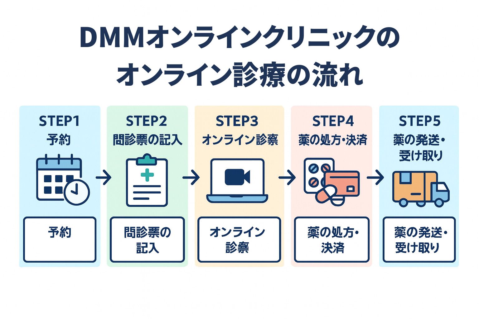 A. 予約~診察~決済~発送~受け取りまでオンラインで完結します。処方後は自宅・コンビニ・ロッカーで受け取り可能です。詳しい手順はこちら。