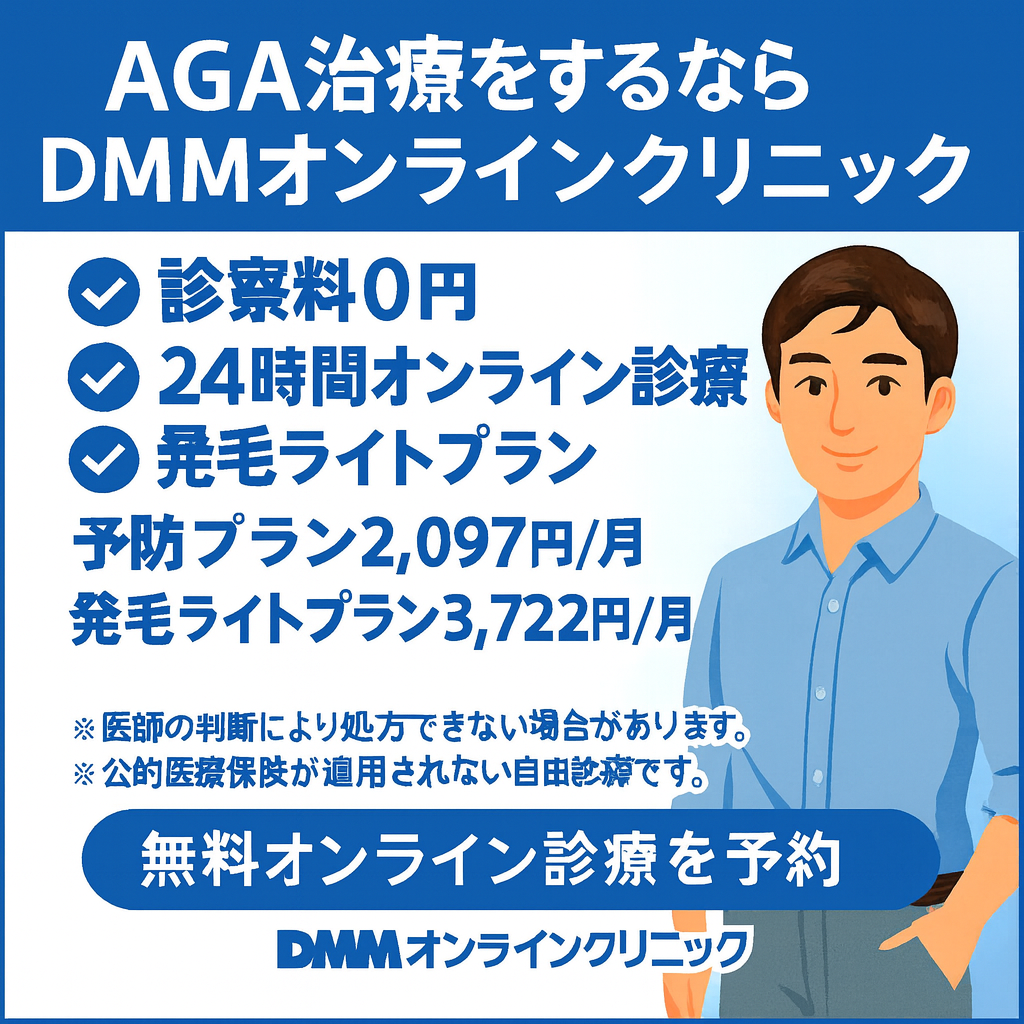 AGA治療は多くのオンラインクリニックが提供しています。DMMオンラインは「初期費用を抑えつつ、月いくらで続けられる設計」が強み。料金・受け取り方法・プランを比較しながら、自分に合うクリニックを選びましょう。