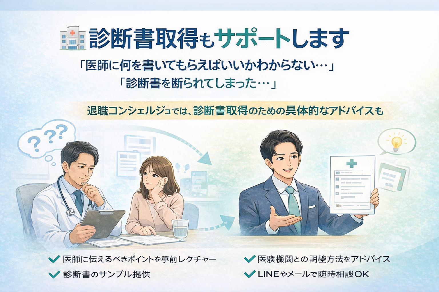 退職コンシェルジュでは、診断書取得のための具体的なアドバイスも実施中!