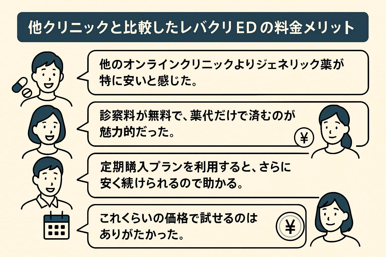 レバクリEDは、その料金の安さに言及する口コミが非常に多く見られます。