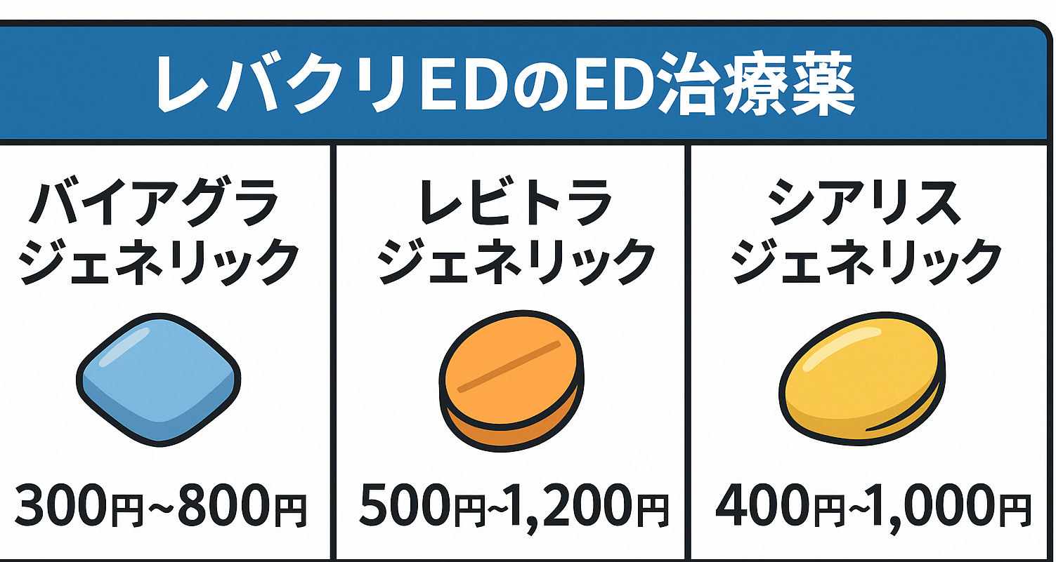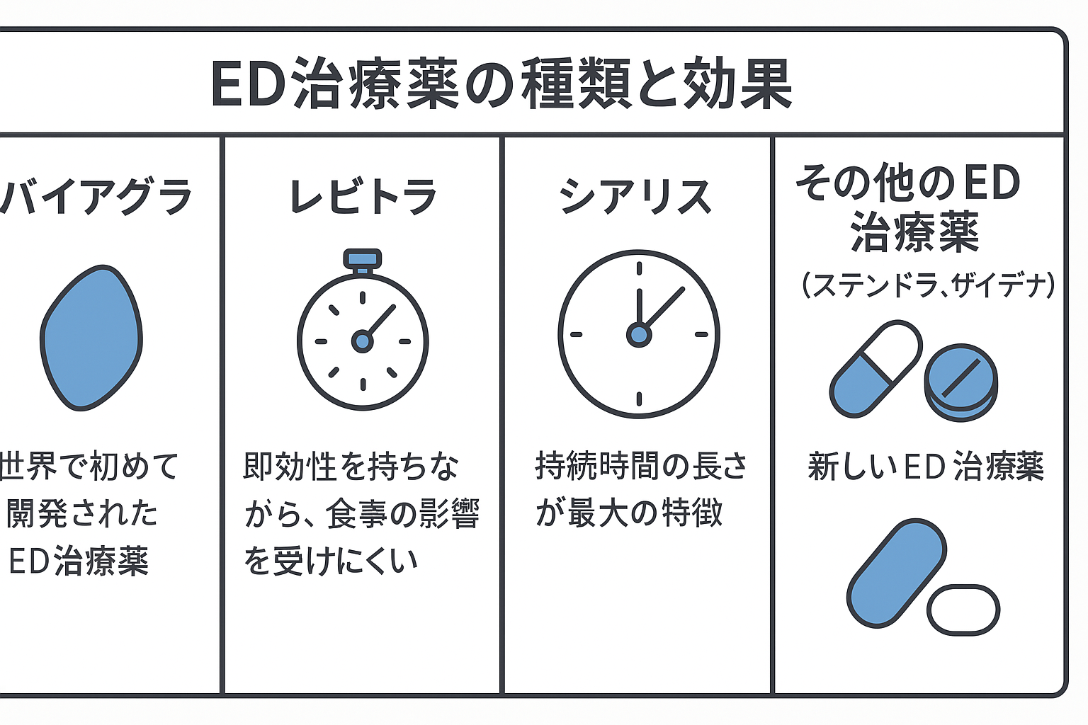 主要なED治療薬には、バイアグラ、レビトラ、シアリスがあり、それぞれにジェネリック医薬品も存在します。レバクリEDでは、これらの代表的な薬を幅広く取り扱っています。