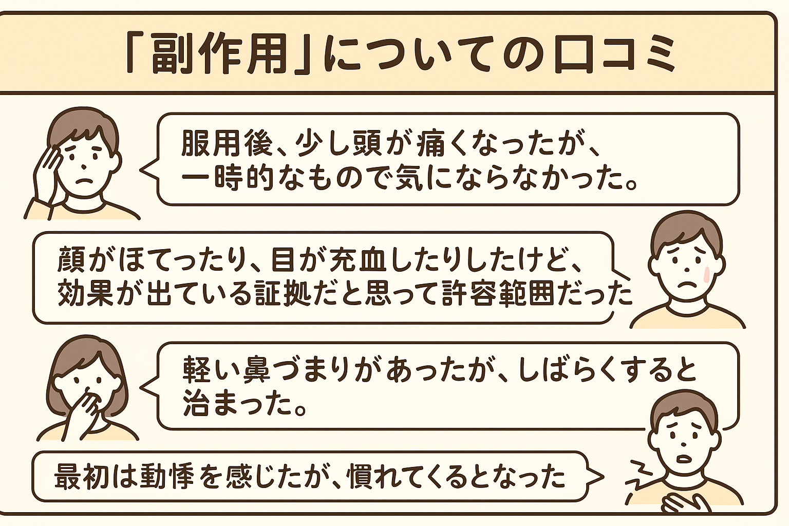 これらの口コミから、頭痛、ほてり、鼻づまり、目の充血、動悸などが報告されています。多くの場合、これらの症状は軽度で一時的なものであり、薬の効果が発現しているサインとして捉えられることが多いようです。しかし、症状の程度や感じ方には個人差があるため、副作用の報告は利用者によって様々です。
