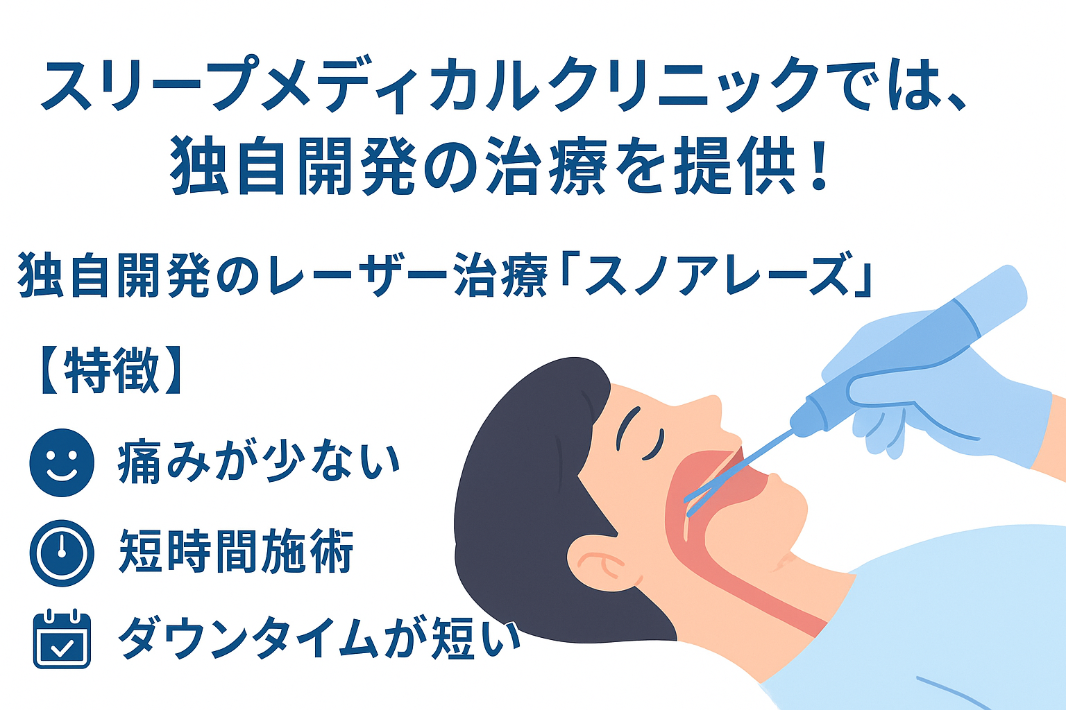 スリープメディカルクリニックでは、いびきや睡眠時無呼吸症候群といった睡眠関連呼吸障害に対して、多角的なアプローチで治療を提供しています。その中でも特に特徴的なのが、独自開発のレーザー治療である『スノアレーズ』を用いた治療です。