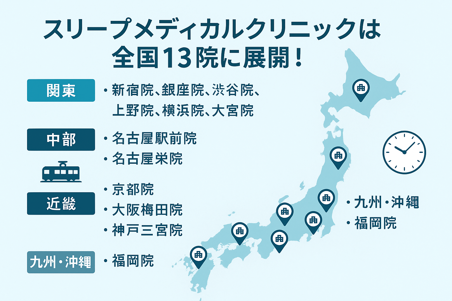 スリープメディカルクリニックは、いびきや睡眠時無呼吸症候群で悩む方がアクセスしやすいよう、全国13院でクリニックを展開しています。利便性の高い立地と、患者様のライフスタイルに合わせた診療体制を整えることで、多忙な方でも治療を継続しやすい環境を提供しています。