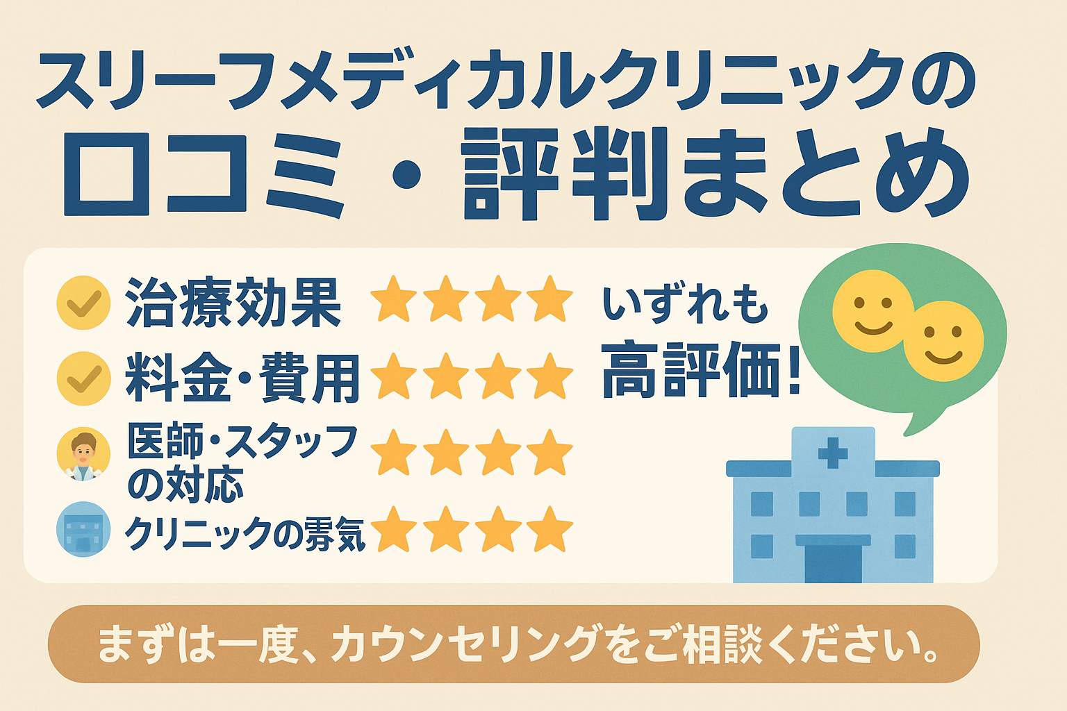 クリニックは、無料カウンセリングで料金体系を丁寧に説明し、患者様が納得して治療に進めるよう努めています。
