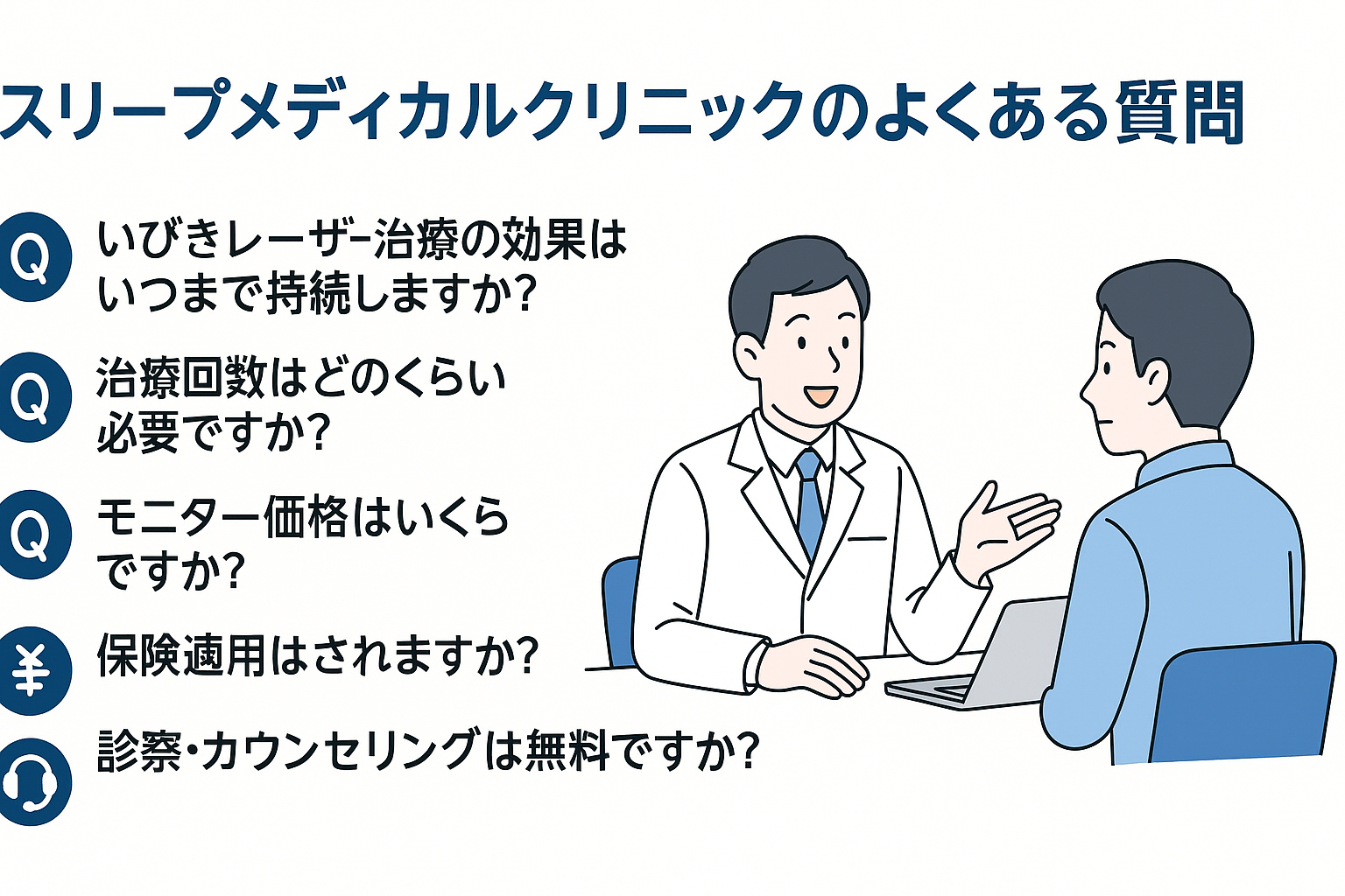 スリープメディカルクリニックの受診を検討している方々から寄せられる、頻度の高い質問とその回答をまとめました。これらの情報が、あなたの疑問や不安の解消に役立ち、安心して治療に踏み出す一助となれば幸いです。