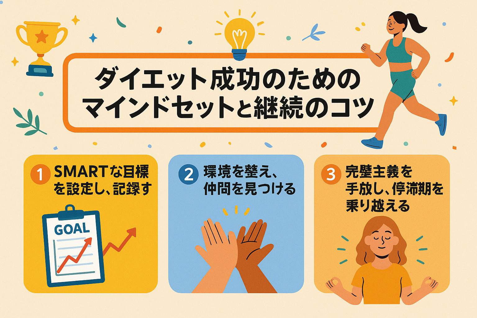 - 目標設定、記録、環境整備、そして適切な休息が、ダイエットの継続と成功をサポートする。